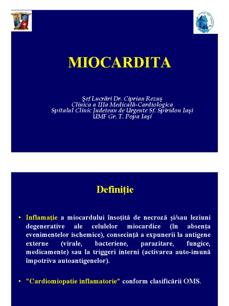 Miocardita - Miocardita: cauze, simptome, tratament - NewsMed.ro / Symptoms of myocarditis include chest pain, shortness of breath, fatigue, and fluid accumulation in the lungs.. Miocardita este o inflamaţie a miocardului, peretele muscular al inimii, şi apare cel mai frecvent pe fondul unei infecţii. Myocarditis is an inflammation of the heart muscle (myocardium). Miocardita sau pericardita trebuie să îndeplinească cel puțin unul dintre următoarele criterii:. Este o boala a miocardului in care muschiul cardiac este structural si functional anormal in absenta bolii arteriale coronariene, a hipertensiunii arteriale, a valvulopatiei, a bolii congenitale cardiace. The duration of problems can vary from hours to months.